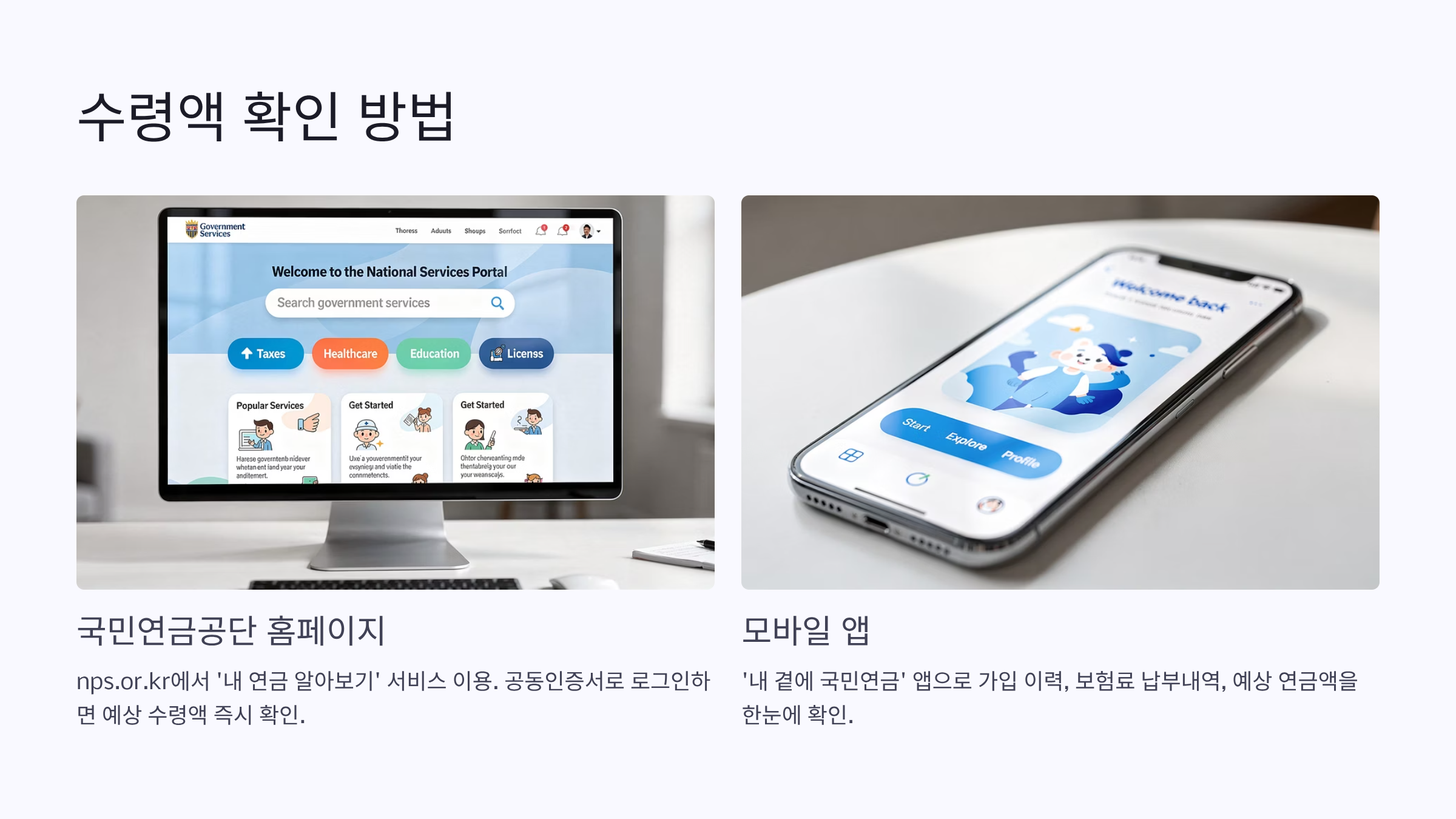 A. 국민연금공단 홈페이지 또는 ‘내 곁에 국민연금’ 앱에서 예상 연금 수령액을 확인할 수 있어요. 공동인증서로 로그인만 하면 가입 이력과 예상 수령액이 상세히 나와요.